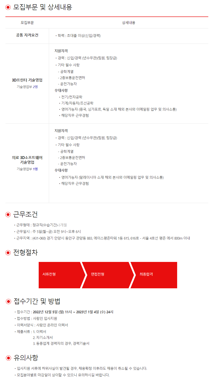 3D프린터 및 의료 3D소프트웨어 기술영업 신입/경력 채용